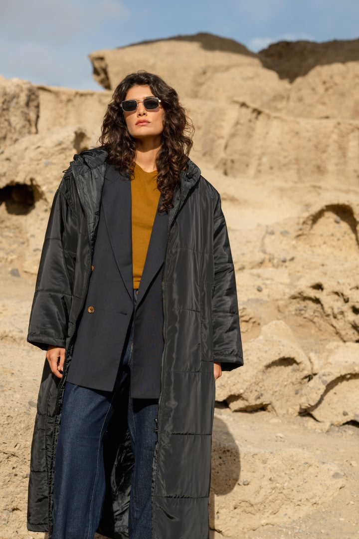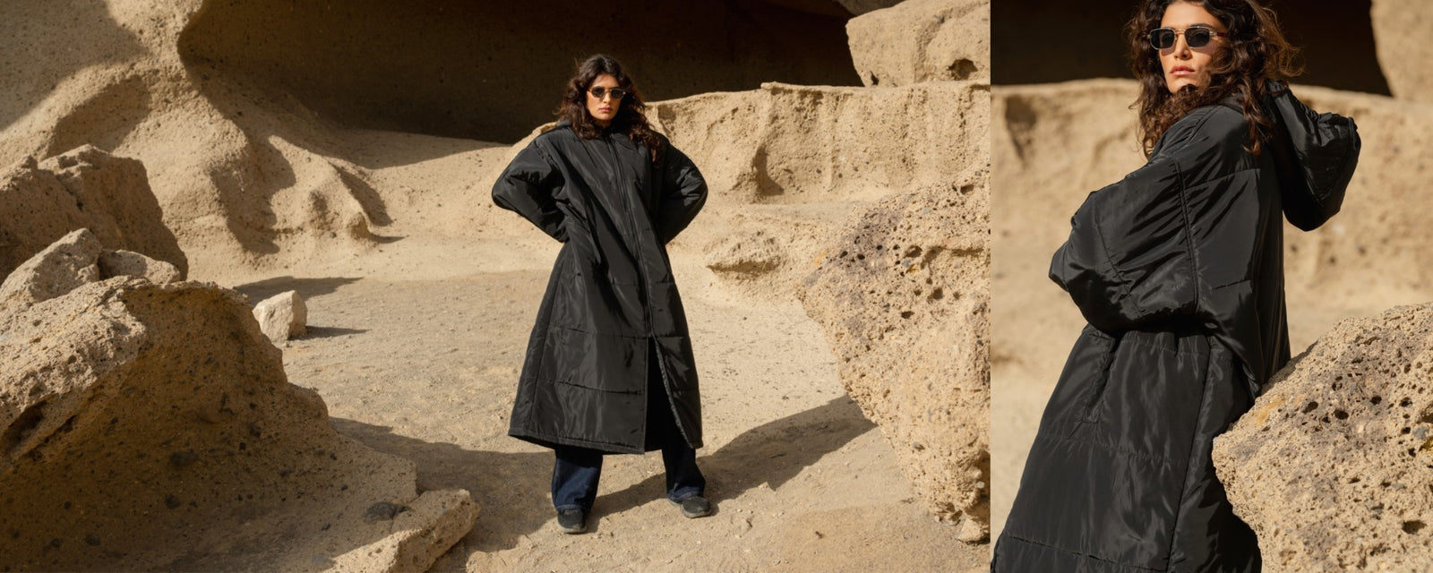 Sittingsuits er designet med en oversized, lige silhouet, der passer til mange forskellige kropstyper og højder. Det rummelige snit giver plads til lag under, mens formen fremstår ren og struktureret. Længden, ærmernes form og skulderkonstruktionen gør, at Sittingsuit tilpasser sig naturligt til forskellige højder, mens den bevarer sin tiltænkte silhouet.