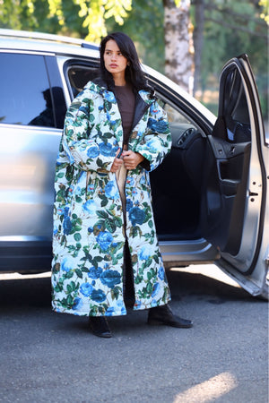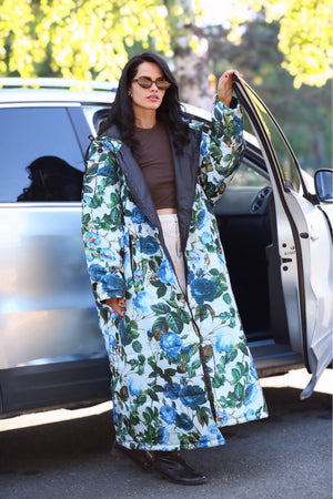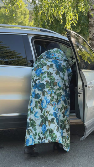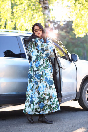 Blue Moon Sittingsuit har blå blomster med grønne blade, på en lys blå baggrund. Foer og lynlås er sort.
